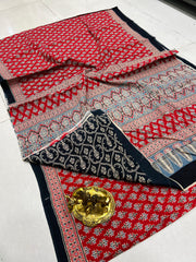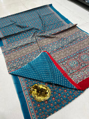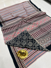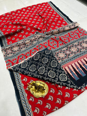 Ajrak Printed Cotton Mulmul Saree with Blouse Piece - Ethnic Indian Wear